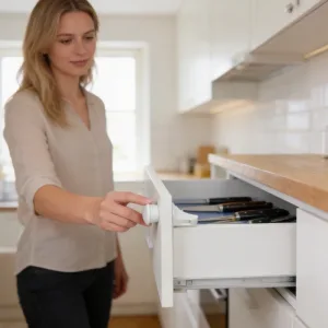 Îmi place că rămân ascunse. Oaspeții nu observă nimic, dar fiul nostru nu poate deschide sertarul cu medicamente. Montajul a durat poate zece minute pentru toate cele patru încuietori.