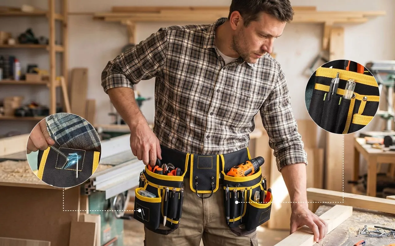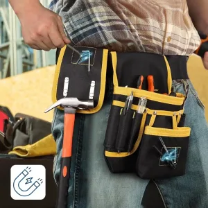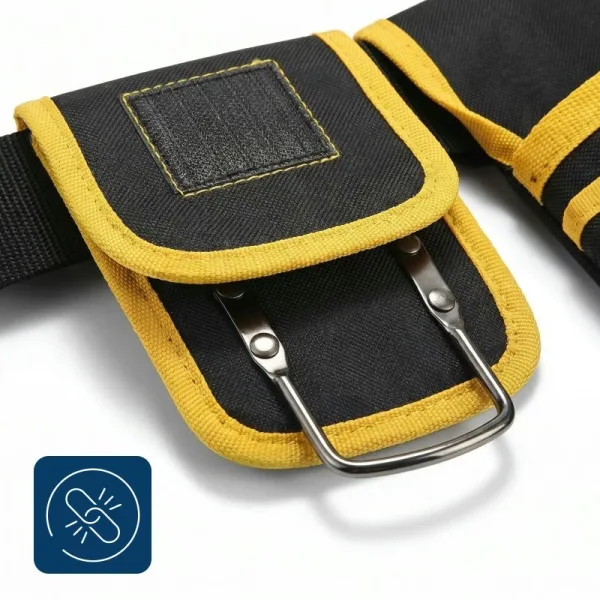 Cusăturile întărite suportă cu ușurință ciocane grele, bormașini și accesorii voluminoase. Țesătura rezistentă respinge praful de pe șantier, deservind constructori, electricieni și instalatori de-a lungul a nenumărate proiecte.