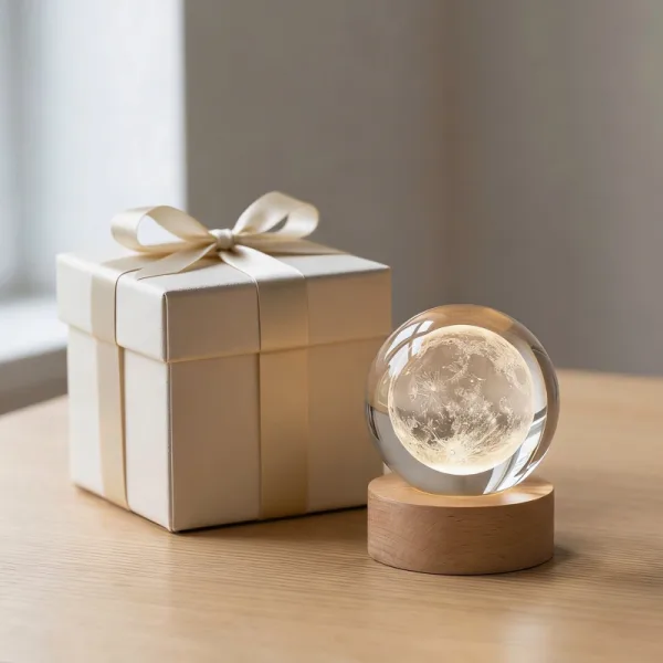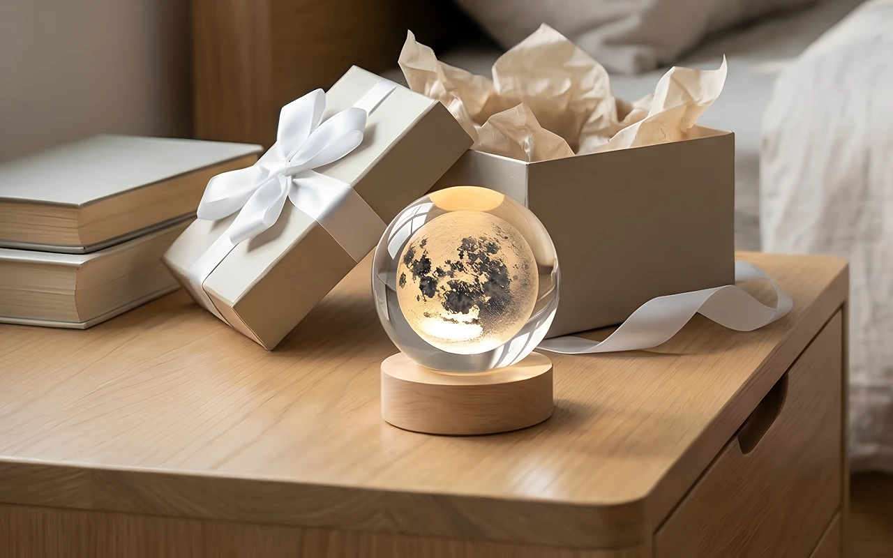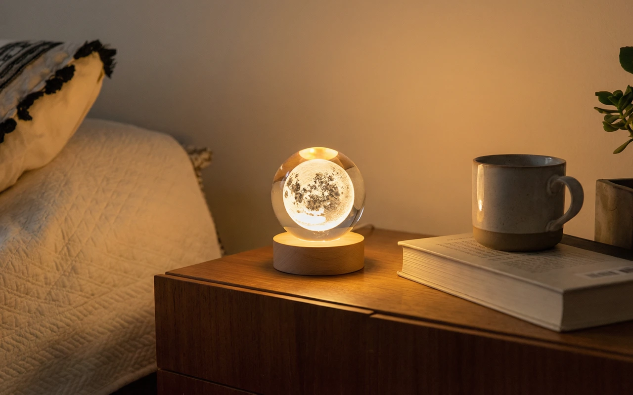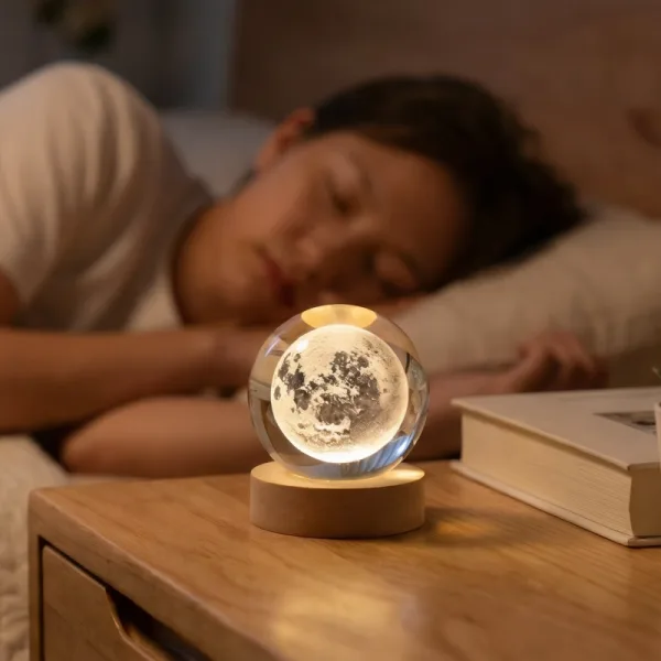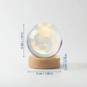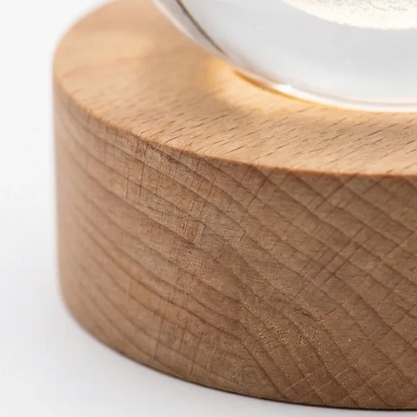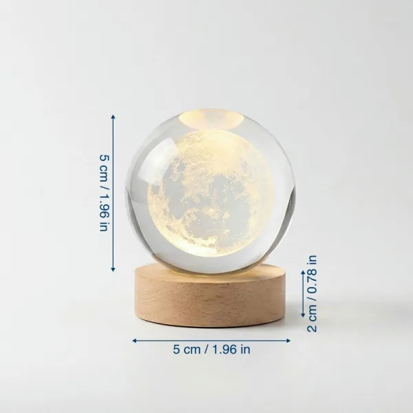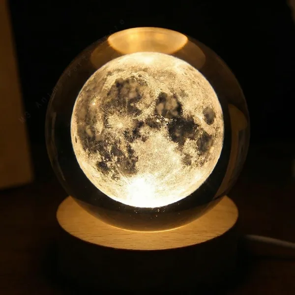 Lampa de cristal arată elegant pe noptiera mea. Baza de lemn se simte solidă, iar globul în sine are niște detalii uimitoare de galaxie.