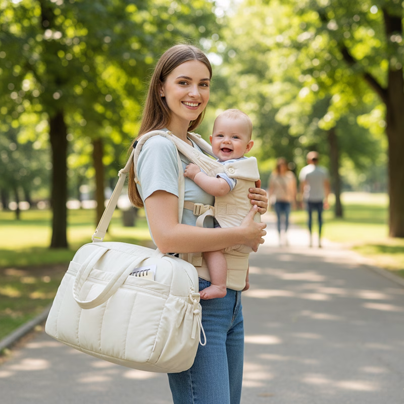 Lucrurile bebelușului meu se pierdeau mereu în vechea geantă, dar aceasta le organizează pe toate. E ușor de purtat prin oraș. Îmi place cât de ușoară este.