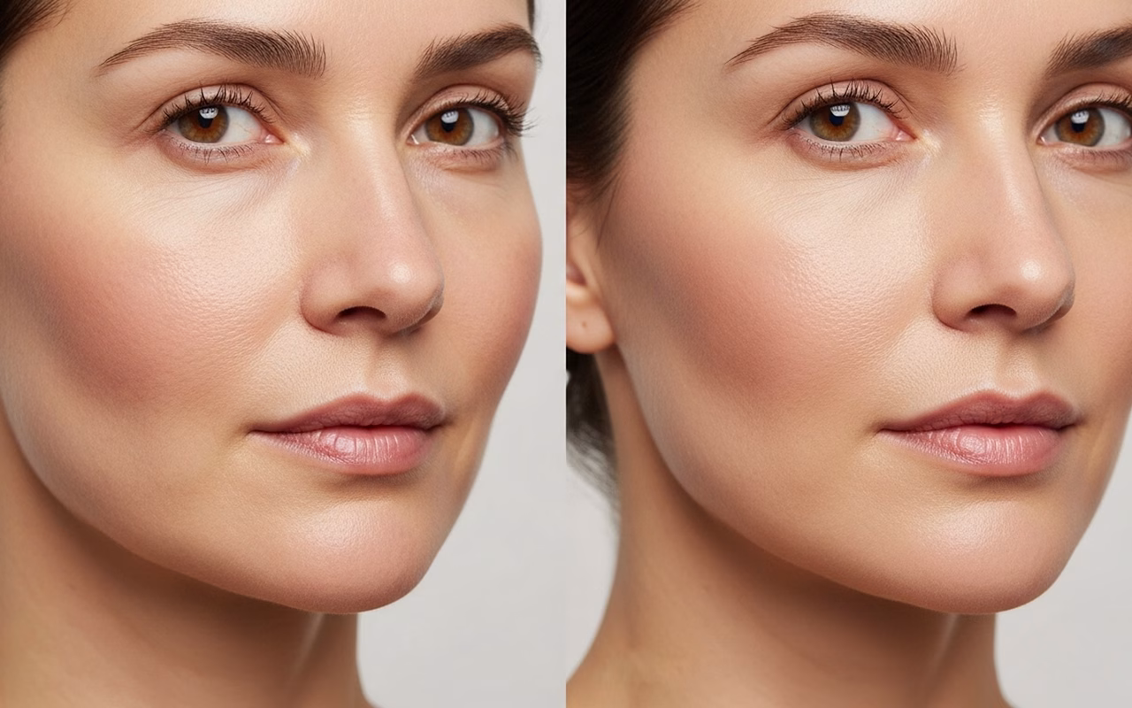 Contururile par mai pronunțate în doar câteva săptămâni. Linia maxilarului pare mai sculptată, iar obrajii par vizibil mai fermi.