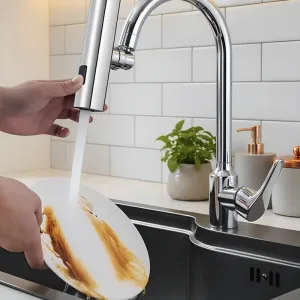 Sunt foarte mulțumit de acest accesoriu! Spălatul oalelor adânci nu mai este o provocare, iar apa nu mai ajunge unde nu trebuie. Schimbarea modurilor e rapidă.