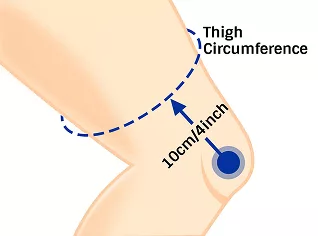 - 2. Înfașoară banda de măsurat în jurul celei mai late părți a coapsei, la aproximativ 10cm/4" deasupra mijlocului genunchiului.
