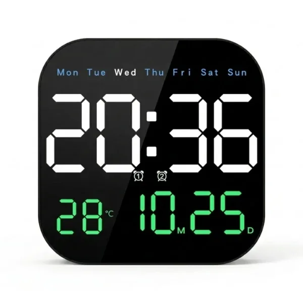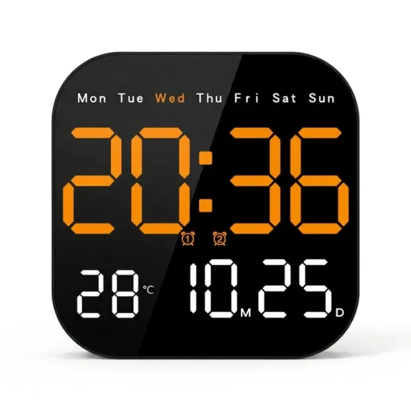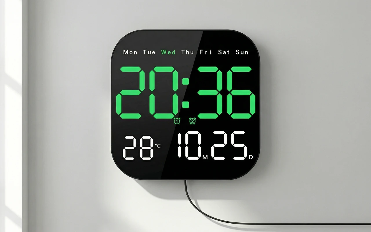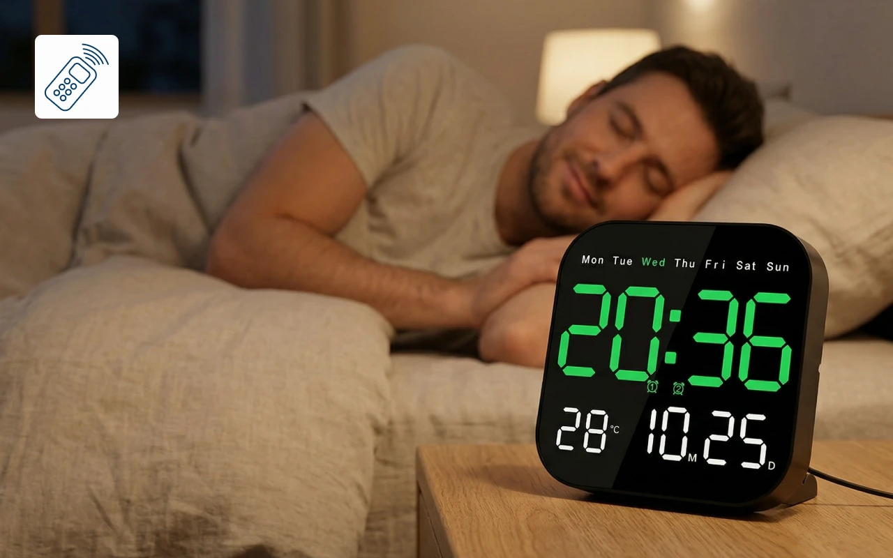 Ceasul de perete Ortorex menține rutina stabilă în fiecare cameră. Un singur ecran afișează ziua săptămânii, calendarul și temperatura interioară. Schimbă setările din pat folosind telecomanda. Zece niveluri de luminozitate se potrivesc pentru somnuri, filme și dimineți.