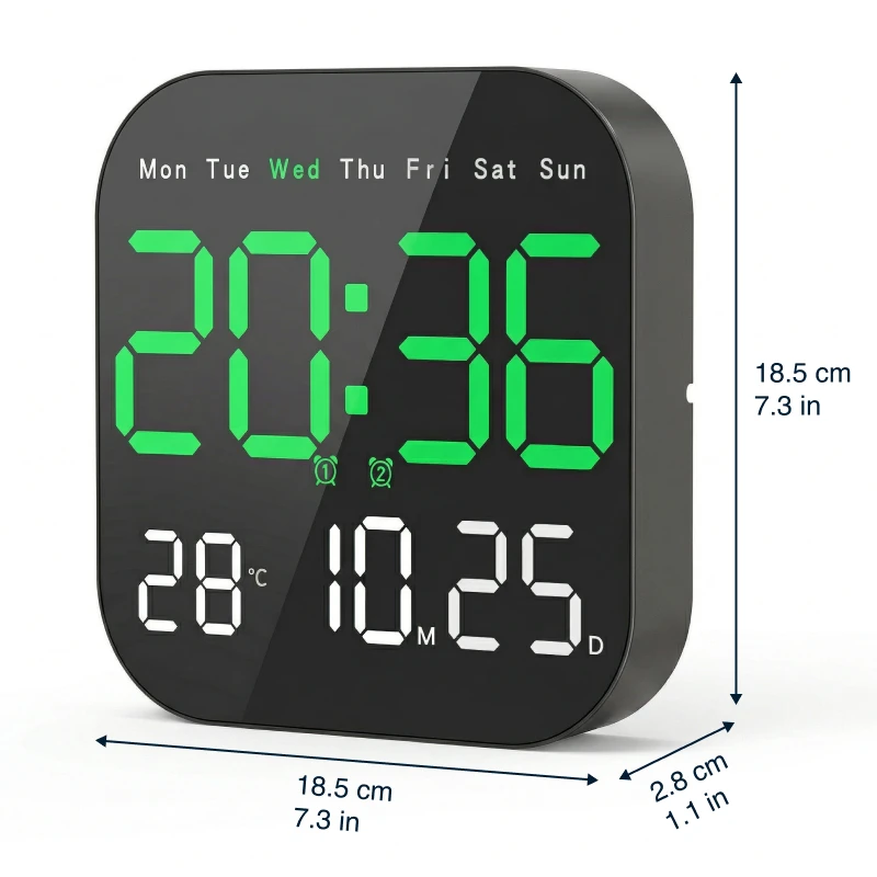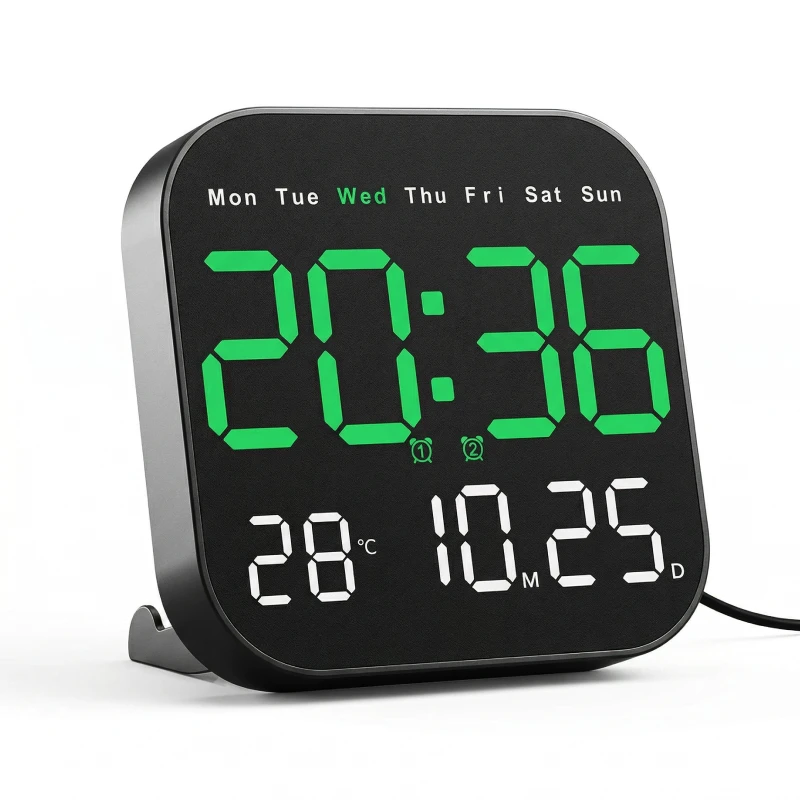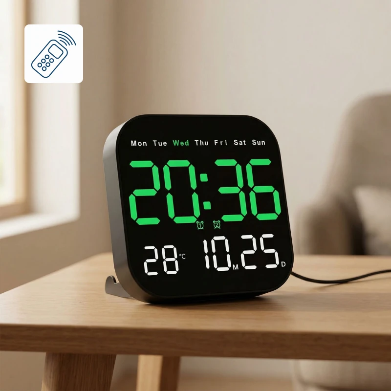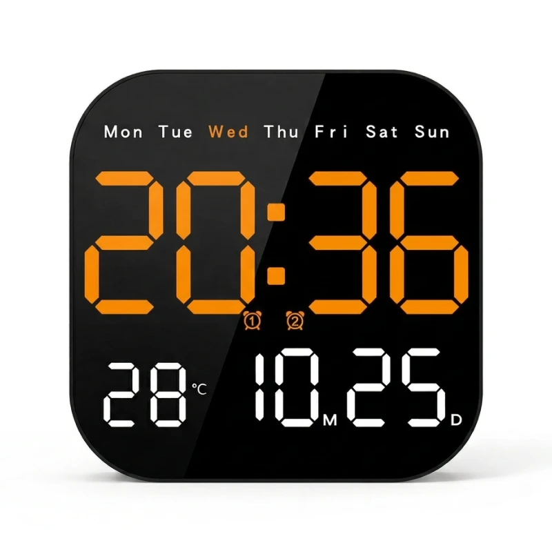 Ceasul de perete Ortorex menține rutina stabilă în fiecare cameră. Un singur ecran afișează ziua săptămânii, calendarul și temperatura interioară. Schimbă setările din pat folosind telecomanda. Zece niveluri de luminozitate se potrivesc pentru somnuri, filme și dimineți.