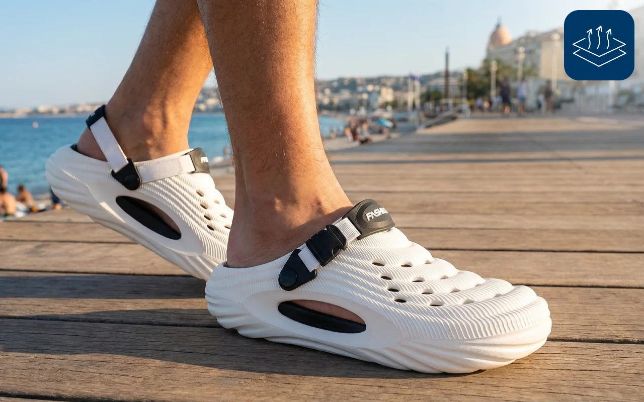 Orificiile de ventilație permit scurgerea rapidă a apei după vizitele la plajă. Picioarele rămân uscate și proaspete, chiar și după ce se udă afară.