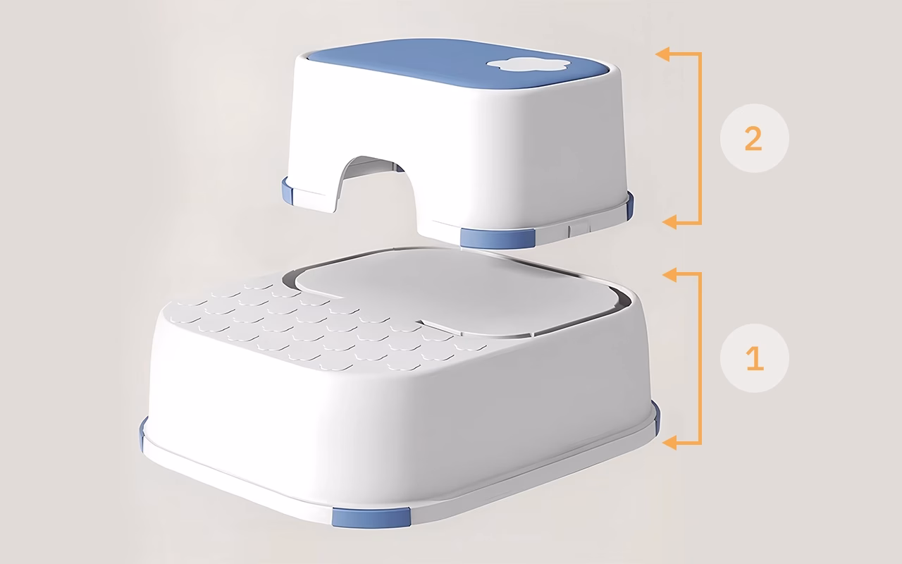 Două niveluri permit celor mici să ajungă cu ușurință la suprafețe mai înalte. Activități precum spălatul pe mâini sau periajul dinților devin simple.
