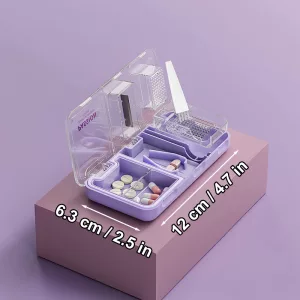Trei funcții cheie într-un singur dispozitiv simplu. Depozitează, împarte și zdrobește comprimatele fără mizerie sau bătăi de cap.