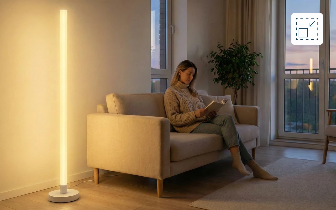 Cadrul subțire și înalt se potrivește perfect în orice colț. Ține podeaua liberă în timp ce luminezi camera cu un stil modern.