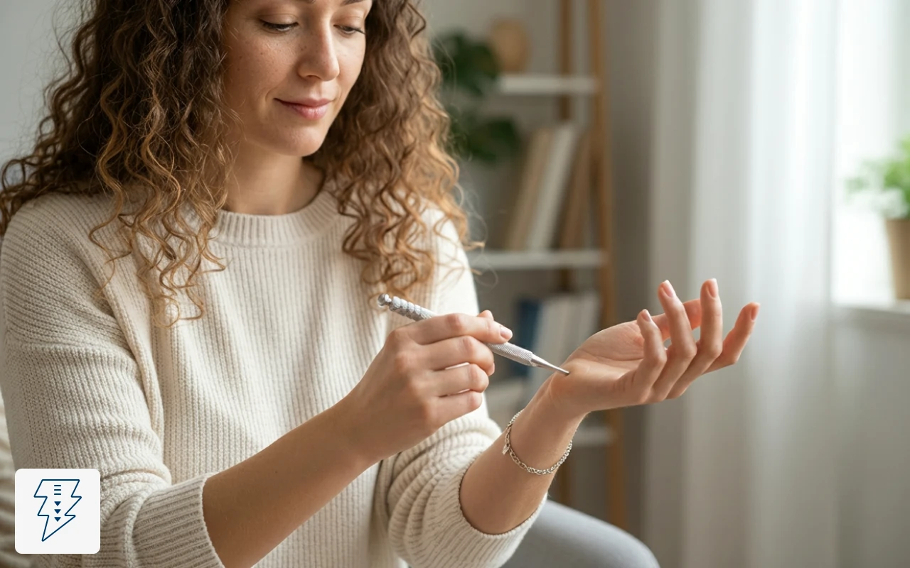 Îl port în geanta de serviciu și îl folosesc între ședințe pe tâmple și maxilar. Reduce vizibil durerile de cap din tensiune și mă ajută să mă concentrez din nou.