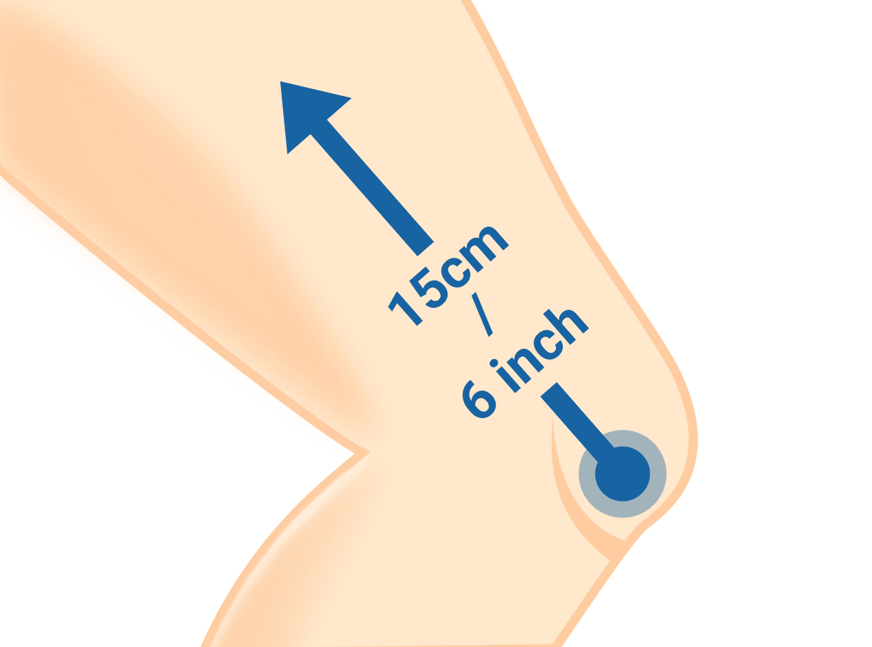 - 2. Așază banda de măsurat la 15 cm/6” deasupra punctului median al rotulei și întinde-o până la gleznă.