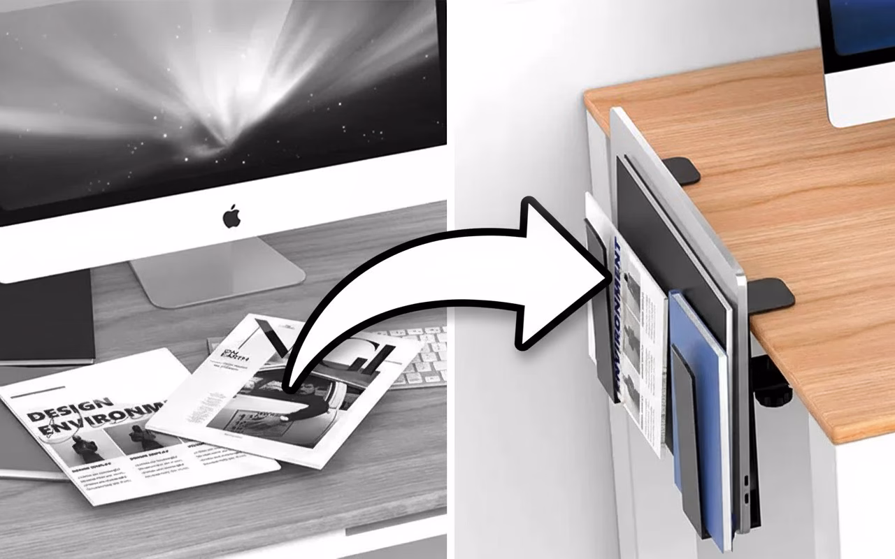 Îmi place să-mi văd biroul într-adevăr curat, nu acoperit cu lucruri. Acest mic suport lateral păstrează totul ordonat toată ziua.