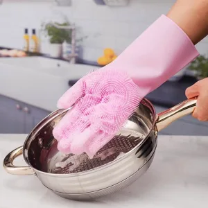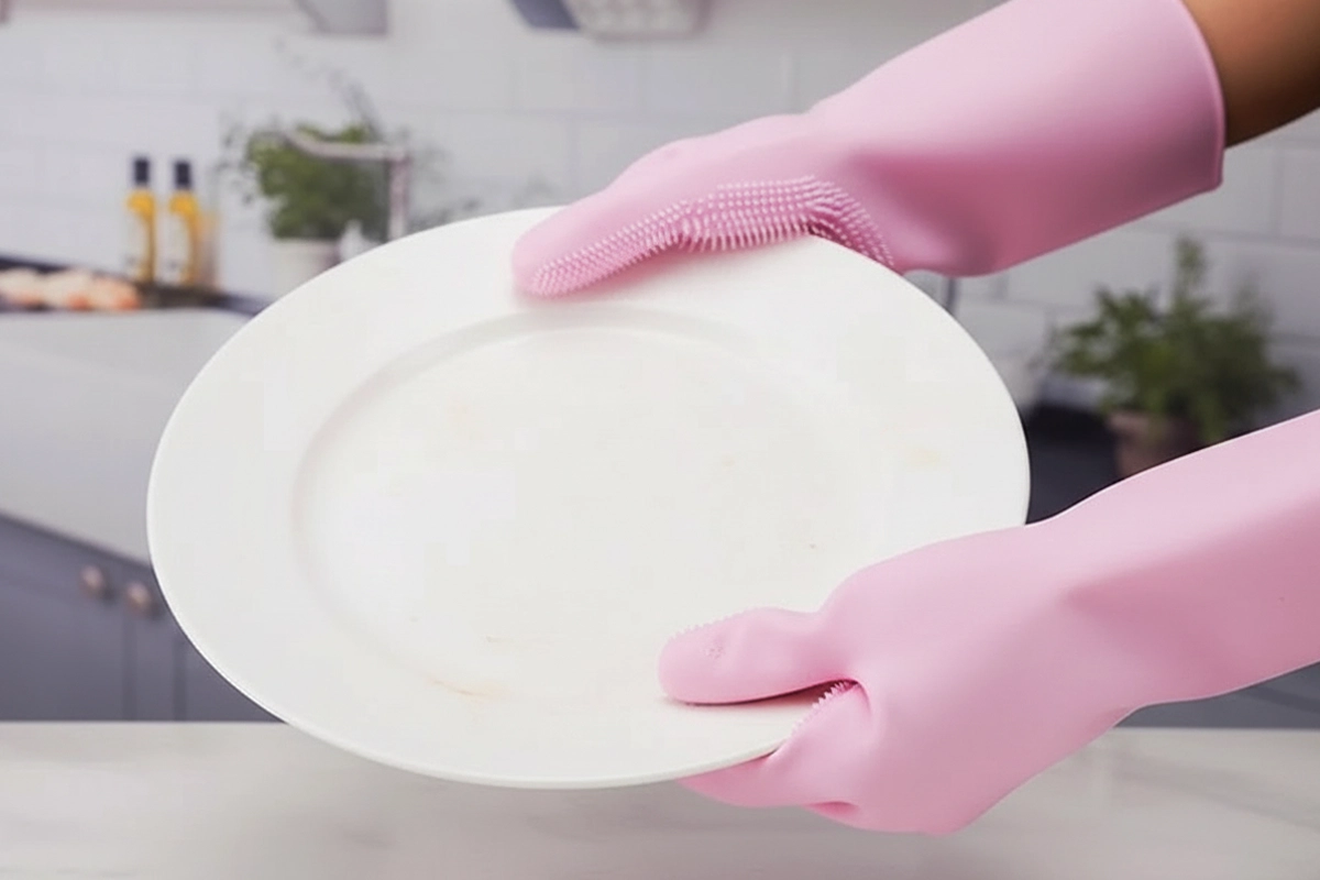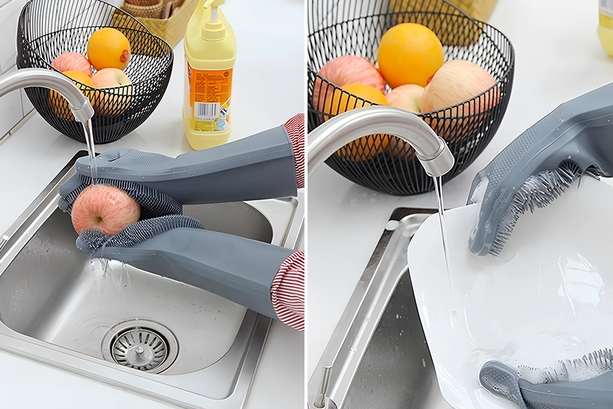 Aceste mănuși de frecat fac spălatul vaselor mult mai rapid! Perii chiar curăță bine și nimic nu zgârie farfuriile mele.