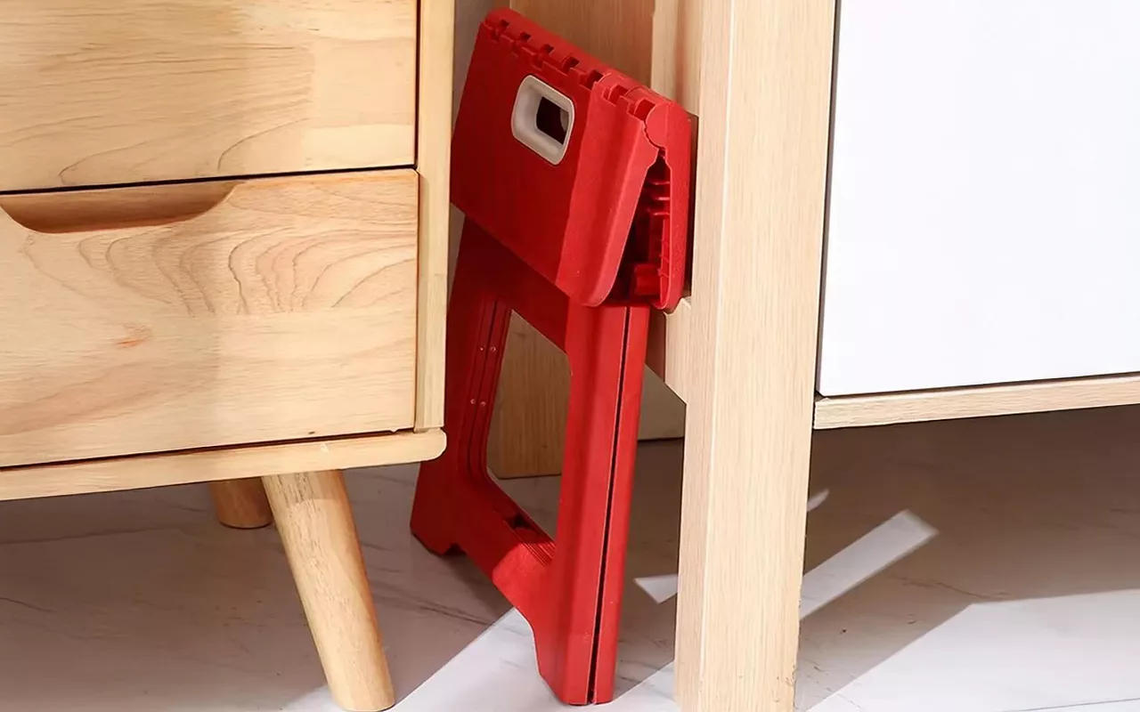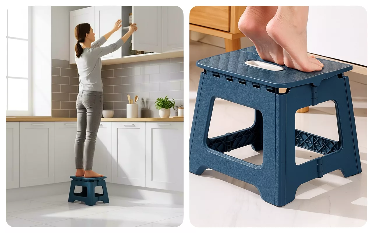 Folosesc acest scăunel zilnic pentru a ajunge la lucrurile de pe rafturile de sus din bucătărie. Se pliază mic și încape sub chiuvetă, foarte practic.