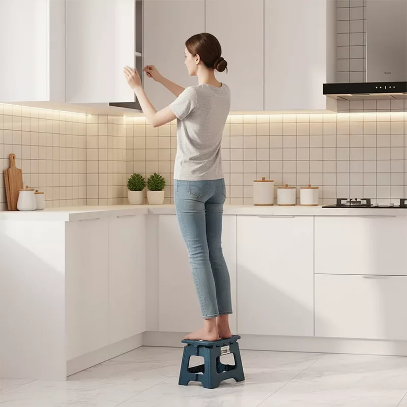 Folosesc acest scăunel zilnic pentru a ajunge la lucrurile de pe rafturile de sus din bucătărie. Se pliază mic și încape sub chiuvetă, foarte practic.