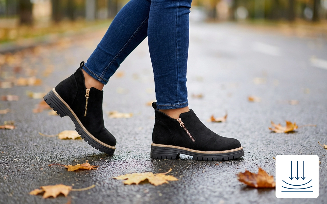 Mergi în siguranță pe suprafețe umede sau alunecoase în fiecare zi. Talpa groasă previne alunecarea și îți oferă încredere.