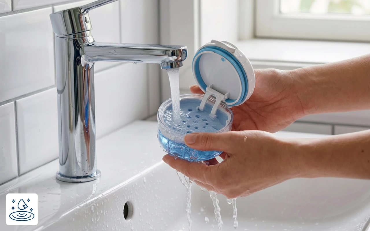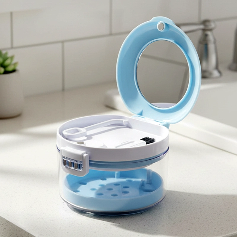 Aveam nevoie de ceva mic pentru proteza mea când călătorim. Această cutie încape în bagajul de mână, nu se deschide accidental și este ușor de spălat după folosirea la chiuvetele din hotel.