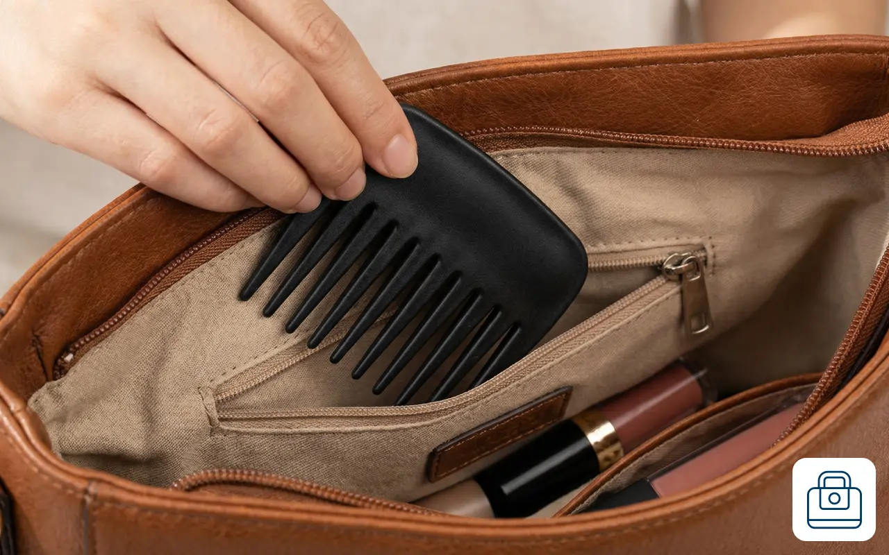 Pieptenele mini are dimensiunea perfectă pentru geanta mea. Netezește părul încâlcit de vânt și se simte plăcut, nu înțeapă sau zgârie. Super după meciurile de fotbal.