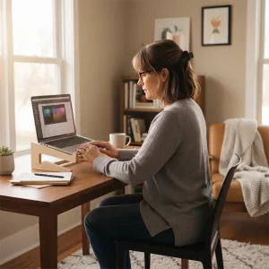 În fiecare dimineață, stau lângă fereastră cu cafeaua și laptopul pe acest suport. Lemnul se simte cald și nu alunecă niciodată când tastez.